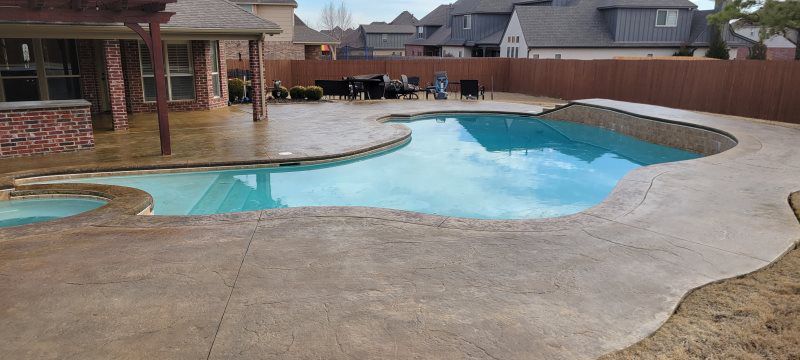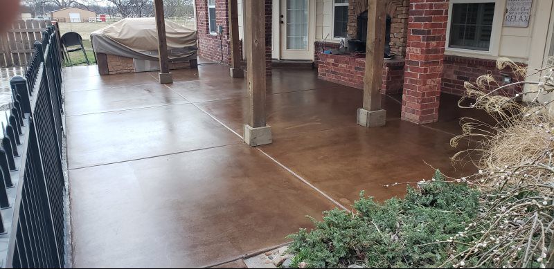 In areas where the surface of the concrete is not in suitable condition to be stained, an overlay may be applied to provide a suitable surface for staining. This overlay can be appled in several different ways to accommodate the homeowner's texture preferences. On some rare occasions, it is not known that an overlay is needed until after the stain has been applied and the area restained.
