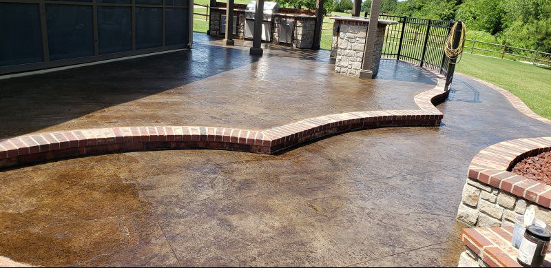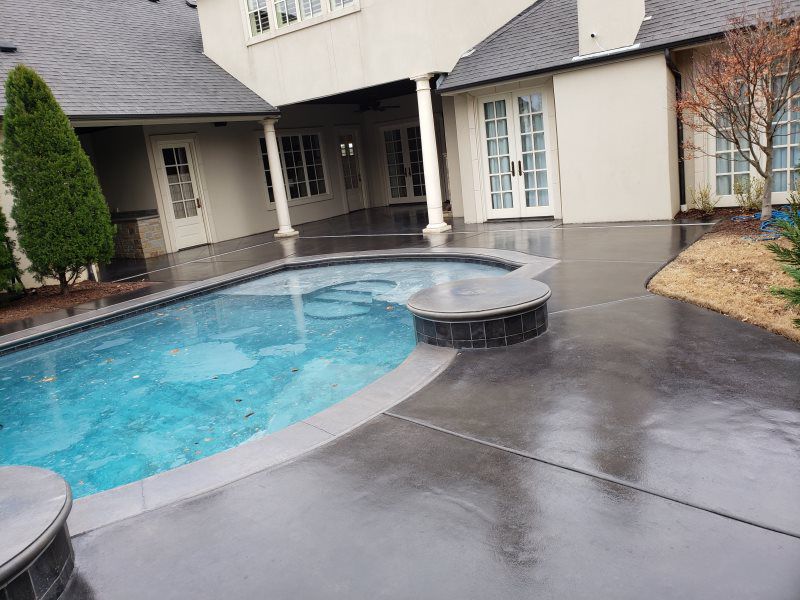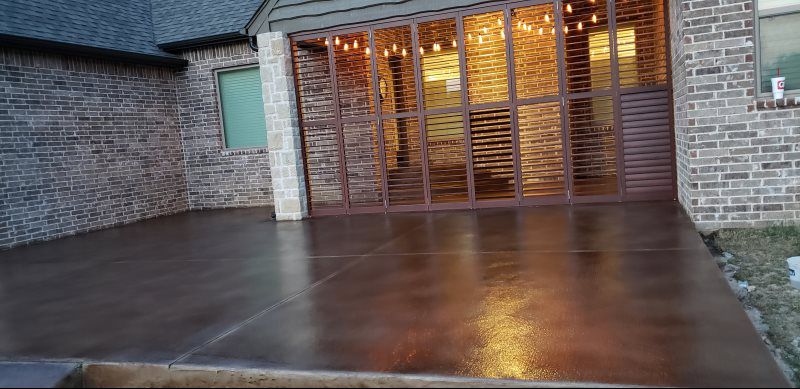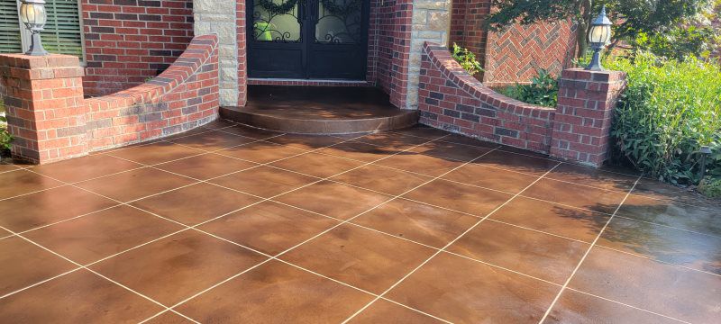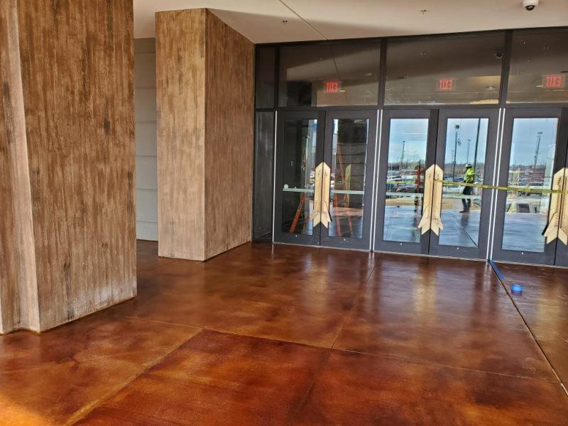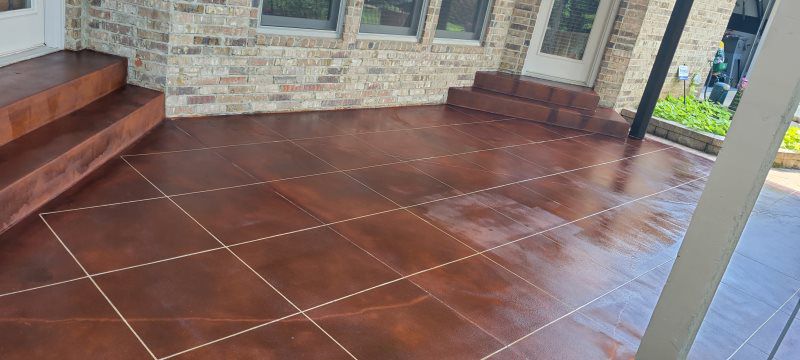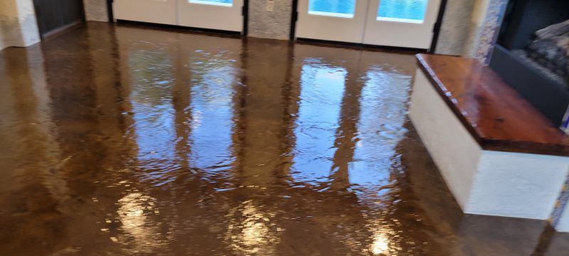 Chemical stain (acid stained concrete) is not a typical stain or dye. Unlike dyes that produce an even color, chemical stain produces the multi-hued, variegated look of natural stone. Chemical stain reacts with the inconsistencies in the finish of your concrete to create a vast difference in color tones ranging from light to dark. Chemical stain may be used in interior and exterior flooring applications. The color outcome of chemically stained concrete is not exact and can be affected by things such as temperature, humidity, wind, and shade/sunlight. As a permanent part of the concrete, chemical stain will not fade, peel, delaminate, or chip independently of the concrete. With the addition of a high quality clear sealer, the stained concrete performs well in high traffic areas. The sealed surface is especially easy to clean and maintain. In outdoor applications we include a non-skid additive in the sealer to minimize slipping.